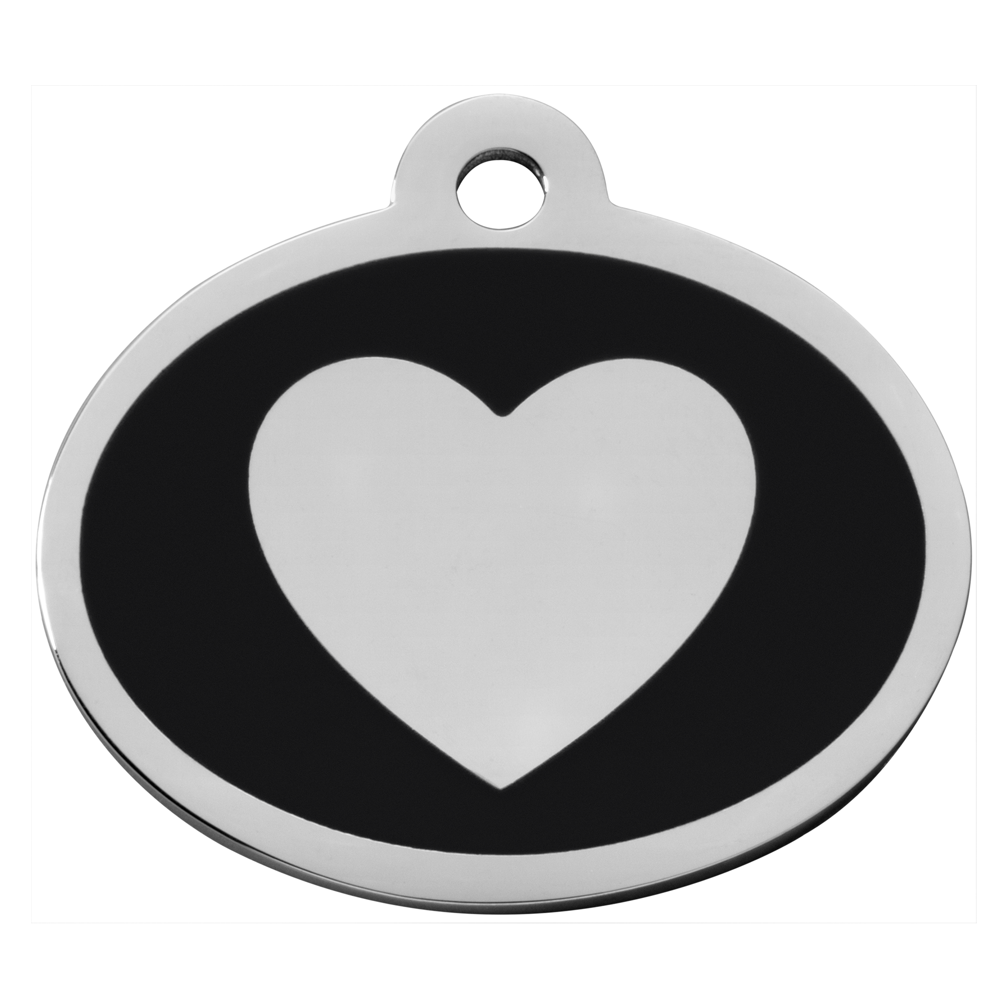 • Distinctive Design: A unique black oval shape adorned with a classic silver heart, offering a stylish alternative to traditional round or bone tags.