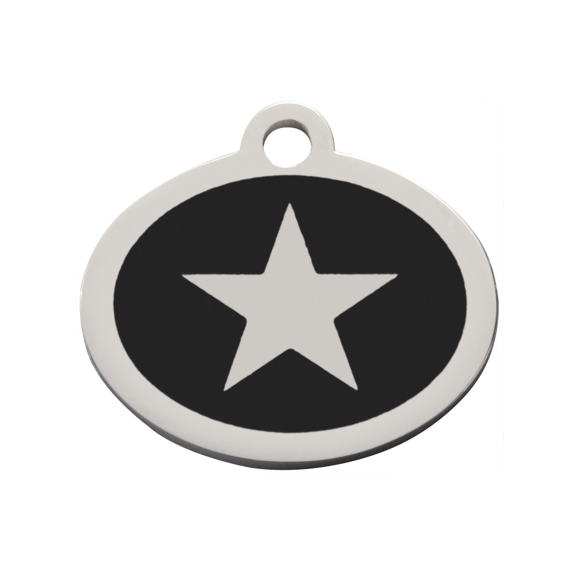 Let your pet shine with our Black Oval Star Pet Tag from our cleveland studios pet tags collection. Featuring a glossy black finish and a raised silver star, this tag adds a bold, stylish touch to your pet’s collar—while serving the practical purpose of keeping them safe and identifiable.