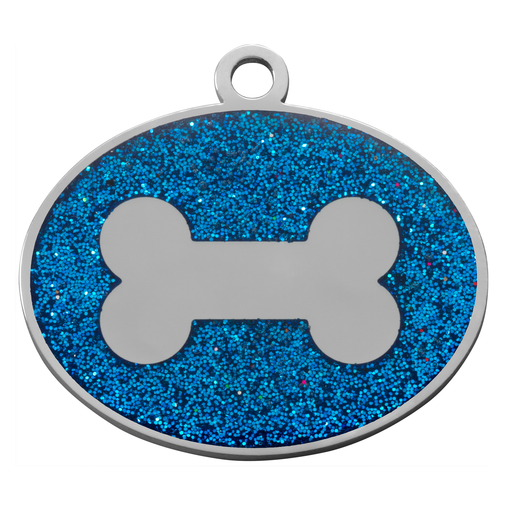 Give your pet a bold, stylish look with the Blue Glitter Oval Bone Pet Tag. With its brilliant blue glitter enamel and raised silver bone design, this tag delivers eye-catching charm with practical peace of mind.