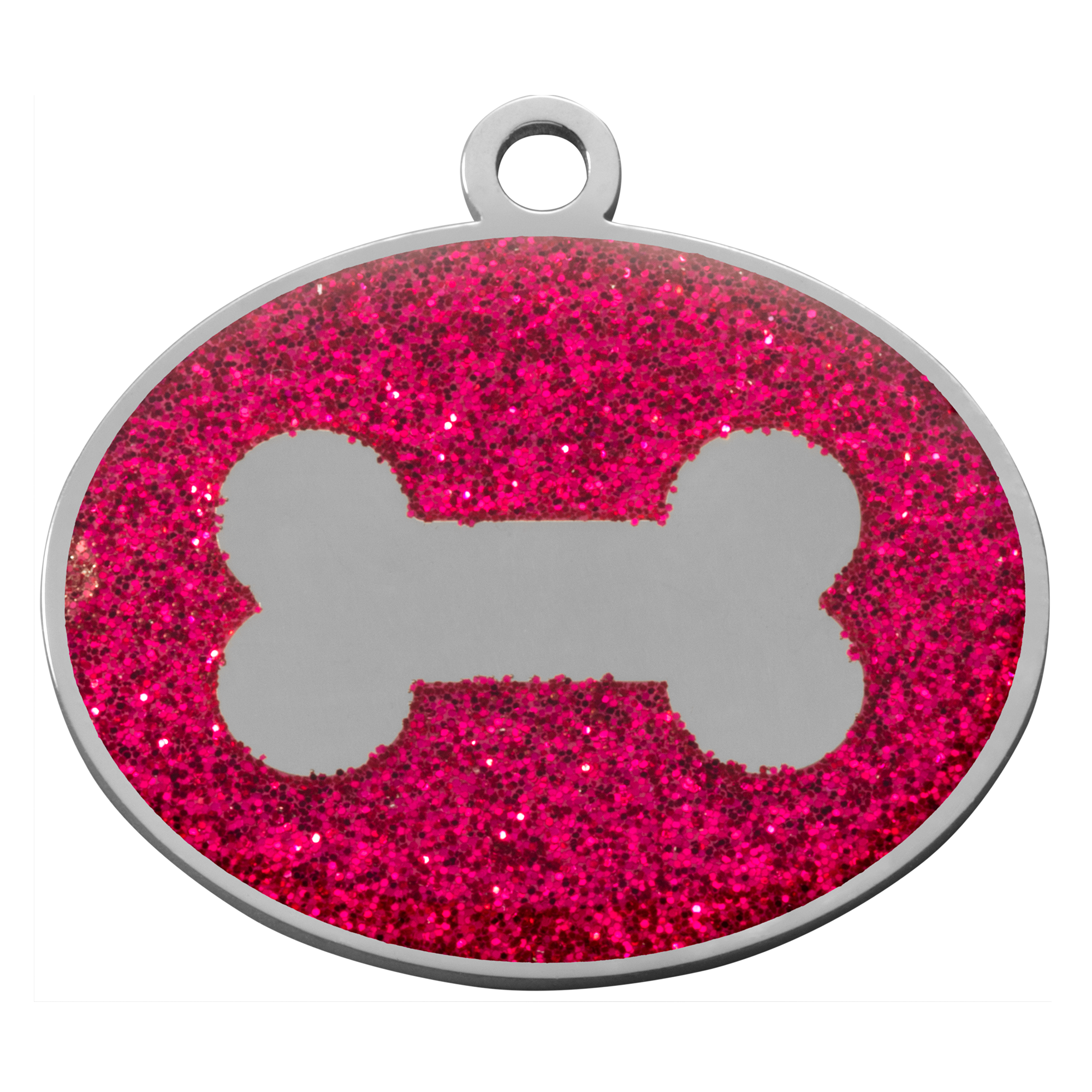 Add a pop of personality with the Dark Pink Glitter Oval Bone Pet Tag. Its rich pink glitter enamel and raised silver bone detail offer a striking look that doesn’t compromise on durability or safety.