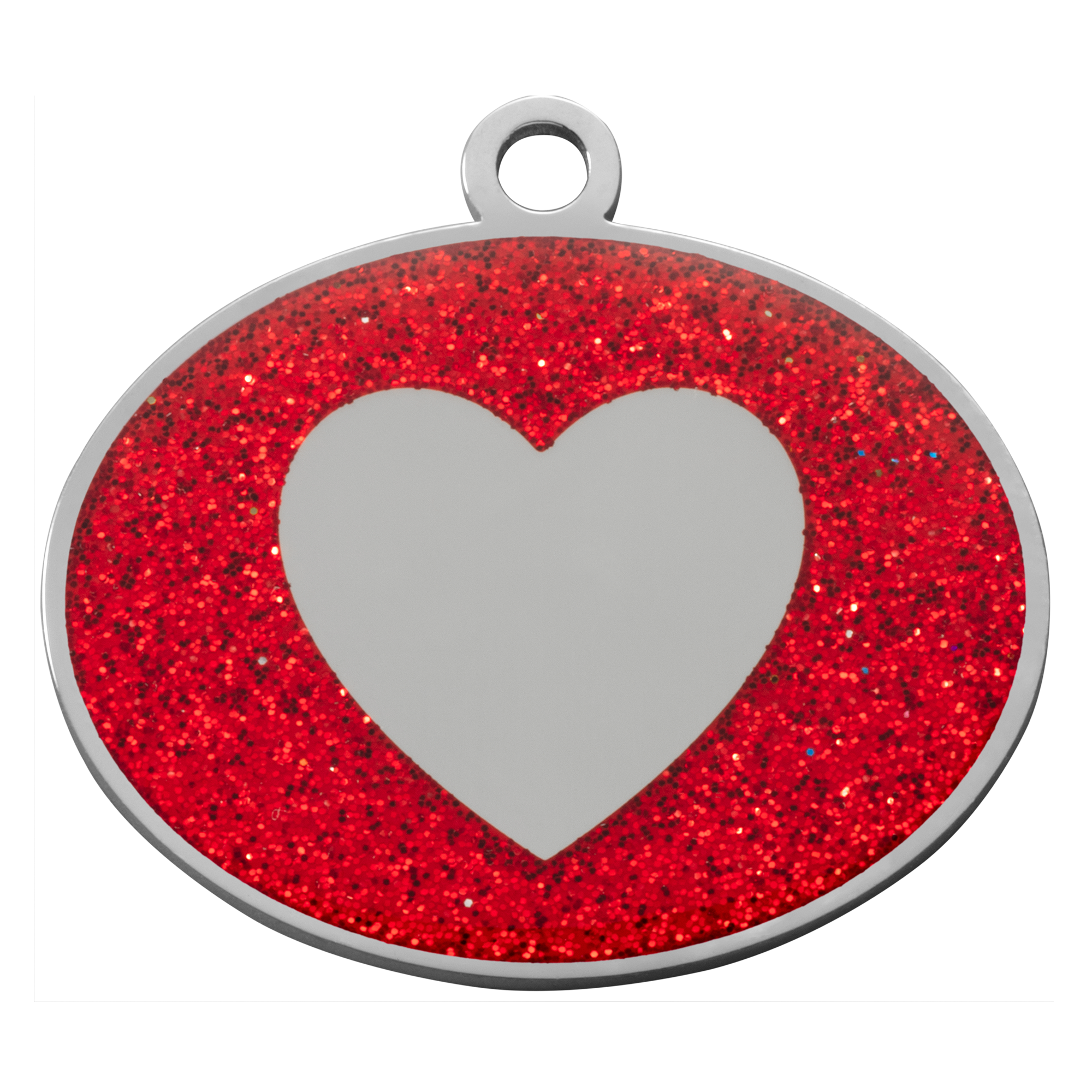 Show your pet some love with the Red Glitter Oval Heart Pet Tag. Featuring a bold red glitter enamel finish and a raised silver heart, this tag combines vibrant personality with reliable safety.